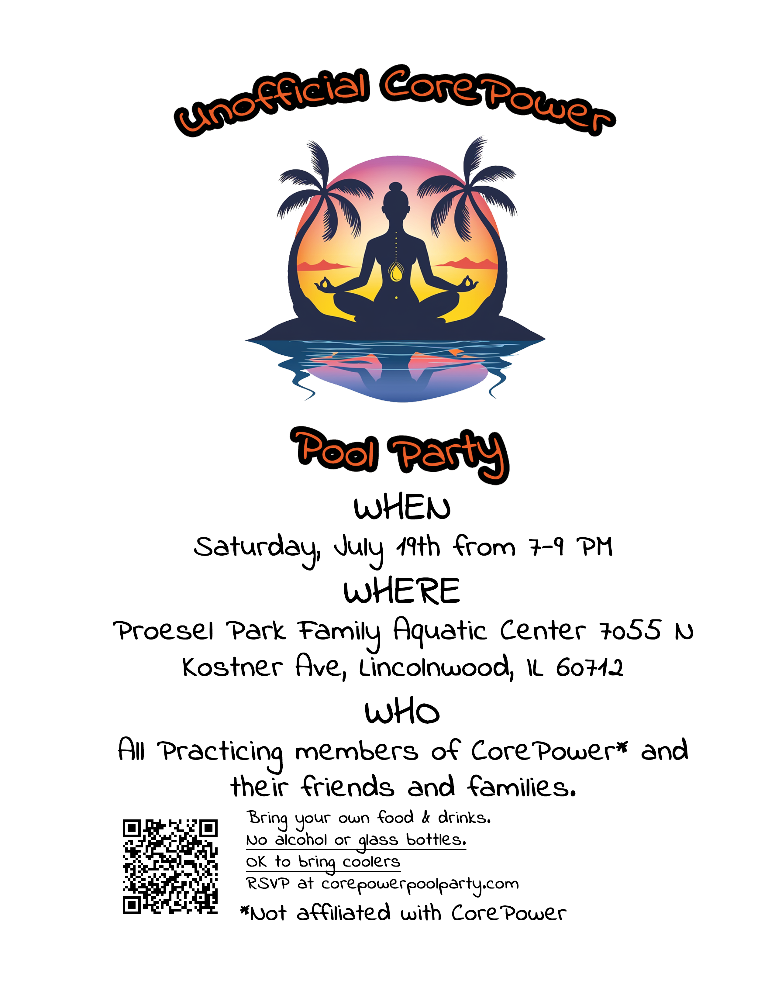 We are CorePower members. We are throwing an unofficial event for all practicing CorePower members and their families and friends. This event will be a pool party that will be held at the Lincolnwood Pool - Proesel Park Family Aquatic Center on Saturday, July 19th from 7-9 PM.